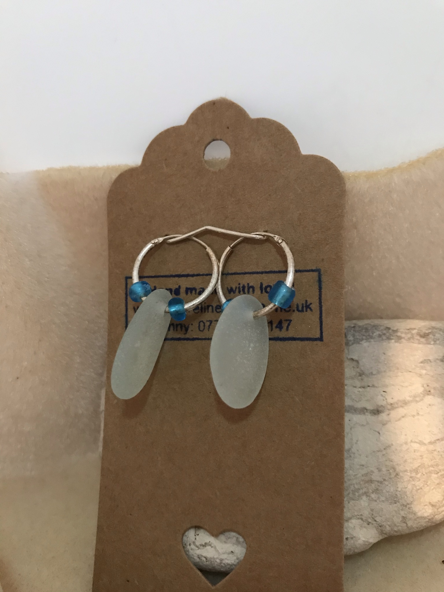 Small Sterling silver hoop earrings with white Seaglass and coloured seed beads.